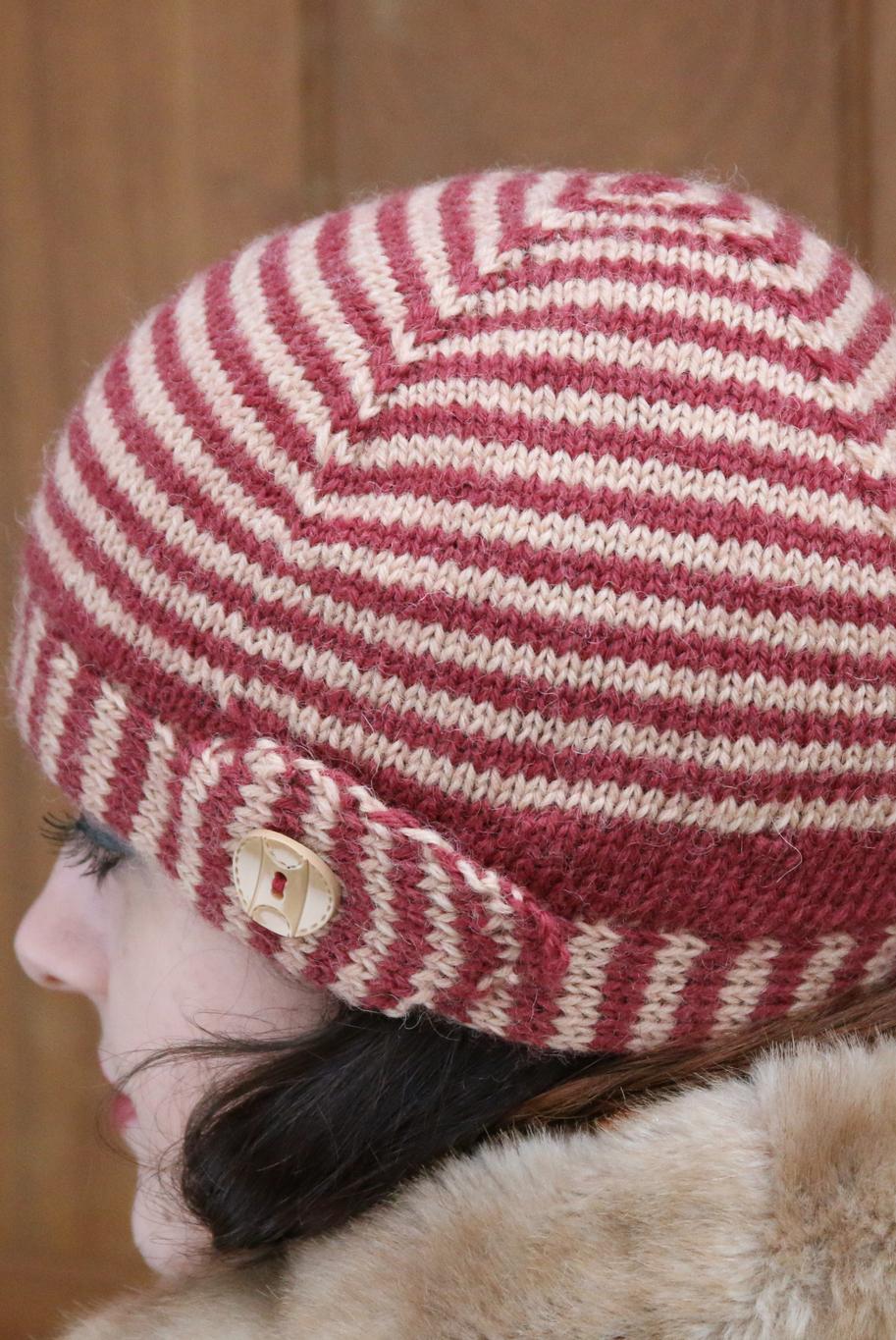 Evangeline is knitted in two parts, beginning with the brim which is knitted from side to side. The crown is then picked up along the brim's long edge and then knitted in the round, with short rows added at the back of the crown to create a deeper hat, along with stripes to match the brim. One perfect button is sewn on to the brim to provide that final flourish.