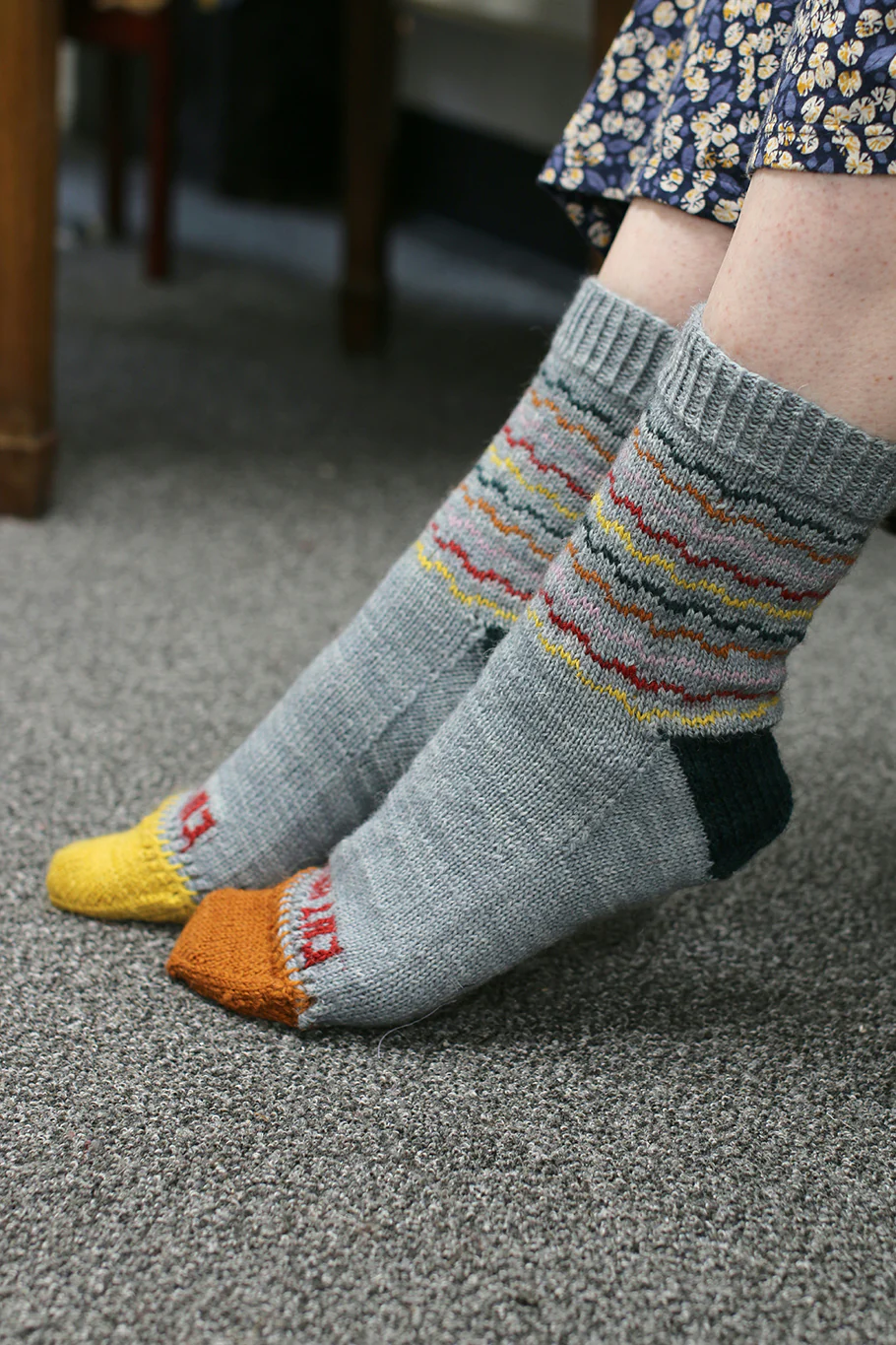 These fun socks are inspired by the ‘make do and mend’ campaign images of the early 1940s which are also used to great effect as the end papers in our final book, Good Evening, Mrs. Craven: The Wartime Stories of Mollie Panter-Downes. In addition I have taken inspiration from the wartime socks known as the ‘Wonder Socks’ which had detachable heels, toes and soles. These were created to enable worn-out parts of socks to be removed, re-knitted and replaced and to show how this concept works, I have created a removable toe section to your socks which means the toe can easily be replaced in its entirety if a hole develops. I hope you have fun with this fascinating technique!