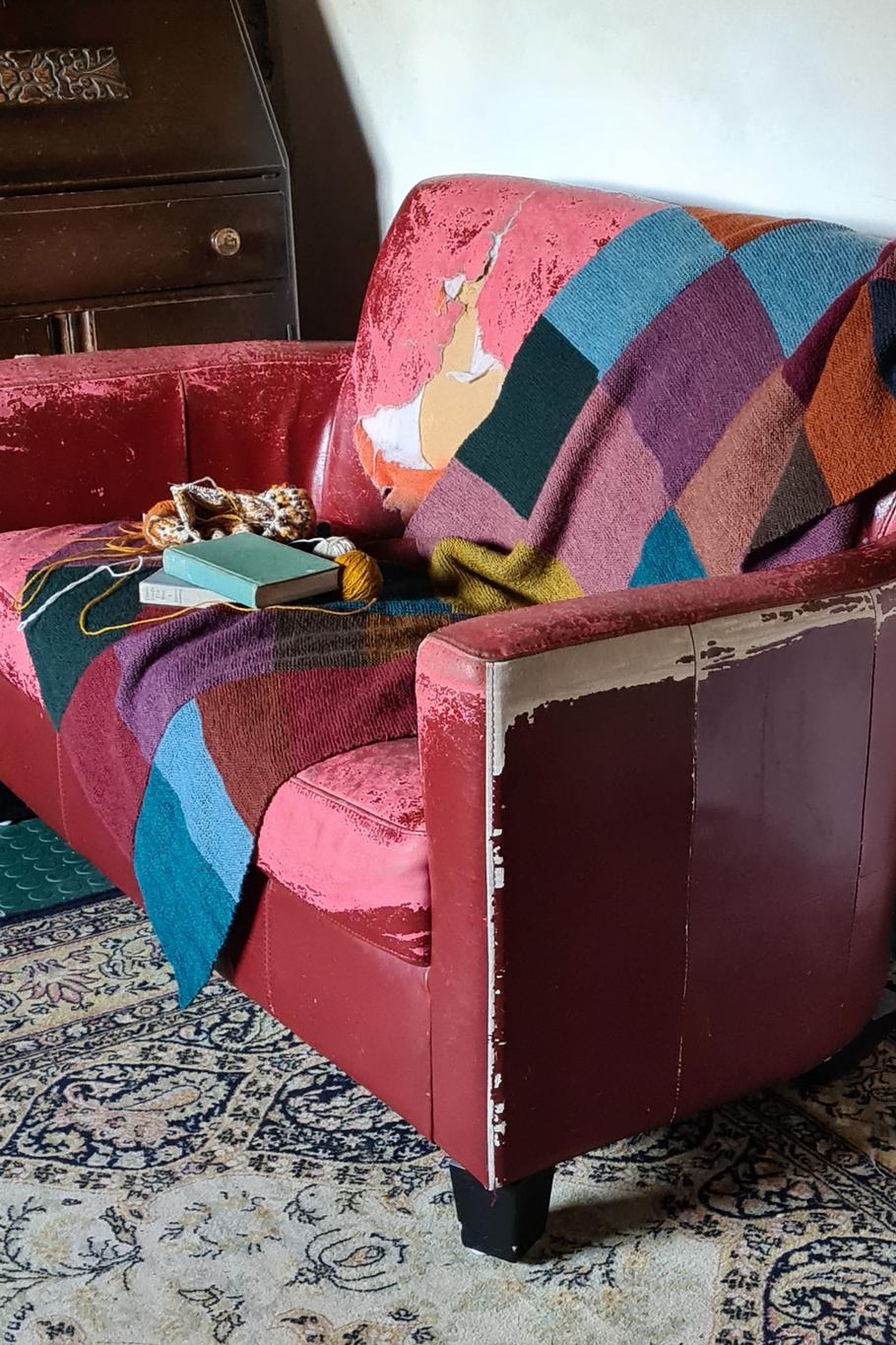 The large and comforting Cecily blanket comprises garter-stitch squares worked together in strips. Once all seven strips have been knitted they are then joined together. The simple shape and stitch pattern provide a canvas for the stunning colour combinations, making them the focal point of this design. A co-ordinating i-cord edging is added for the final finishing touch. The pattern was inspired by an old magazine published by Rowan Yarns that featured a fascinating fictional character called Cecily. One image in particular has remained in Susan's mind: Cecily sits, knitting in hand, with her legs covered by a tartan blanket.
