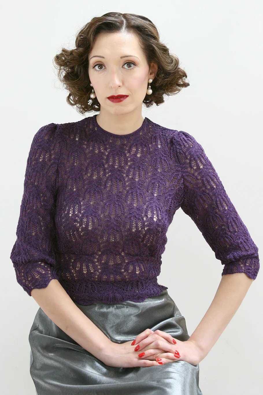 Lady's Evening Jumper is knitted using [productlink: Marilyn = marilyn :productlink], 2 ply laceweight or [productlink: Madeline = madeline :productlink], fingering weight depending on the size being made. Shown here in shade Black Narcissus, a vibrant purple.