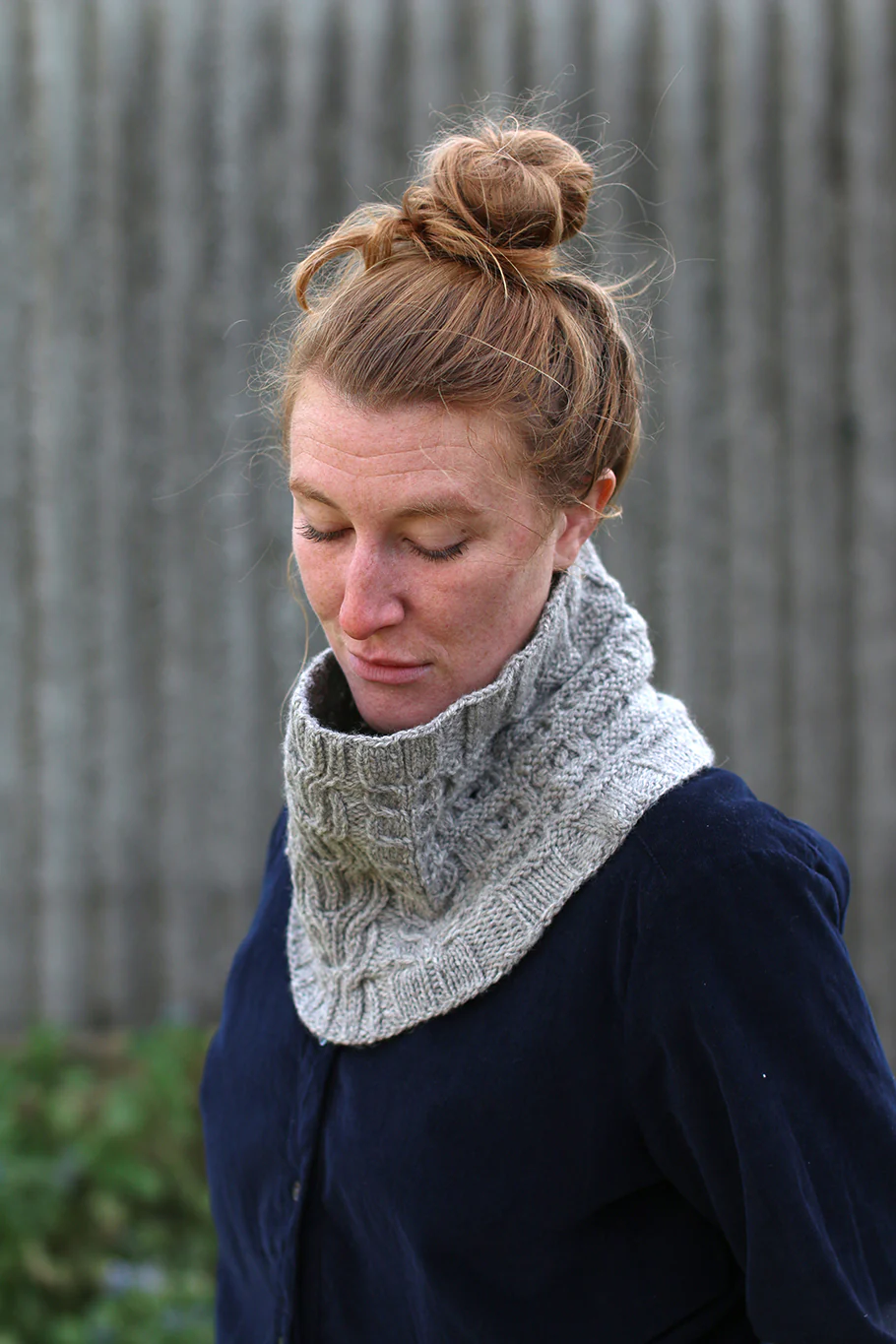 Tyto Alba is knitted in our Barn yarn, a DK weight, 100% British wool, with just the right amount of drape for this soft, comforting cowl and yet enough character to emphasise the beautiful textured pattern and sculptural cables on its surface.