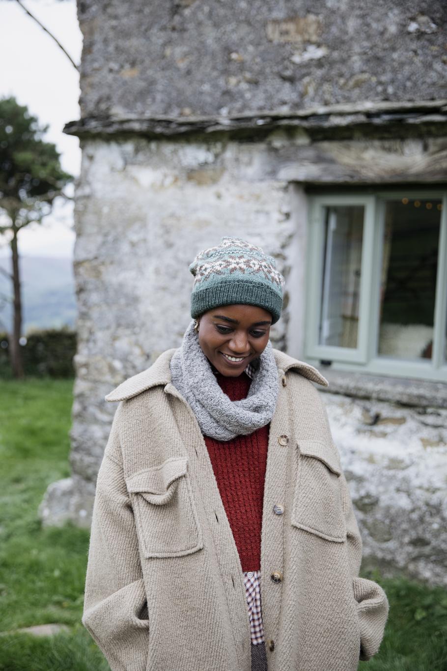 The Potter cowl, inspired by the life and work of author Beatrix Potter, is a cosy textured cowl perfect for keeping you snug on a chilly day, with the double layer providing added warmth. The simple twist stitch - also used in the [productlink: Beatrix vest = pattern-beatrix :productlink] - creates an intriguing surface pattern. The cowl is knit in the round and commences with a provisional cast-on to enable the work to be joined into a tube. As the main pattern is worked, needle sizes are changed to create shape without having to add or remove stitches.