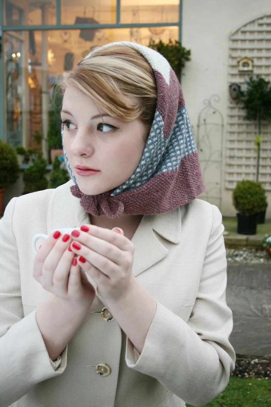 This square scarf is inspired by the silk squares worn by elegantly dressed ladies of the 1950s. It is knitted in one piece from one straight edge to the other using a combination of Fair Isle and Intarsia techniques. This pattern offers an interesting colourwork challenge to an intermediate or experienced knitter within a simple shape.